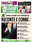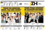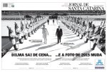 Aqui estão algumas capas que fogem à mesmice ao tratar de um mesmo assunto, o primeiro dia da posse de Temer e da saída de Dilma. O Metro tem surpreendido a cada dia. Pena que seu conteúdo não empate com a forma, porque os jornalões produzem mais e tem mais páginas, repórteres e fotógrafos. O Hora, de Florianópolis, se inspirou, provavelmente, no Zé Simão, da Folha. Apresenta o Temer como num filme de terror, a manchete A ERA TEMER em fonte de vampiro, e uma lembrança oportuna: hoje é sexta-feira, 13. O Zero Hora ousou: juntou capa (com Temer) e contracapa (com Dilma). O Correio Braziliense e o Diário Gaúcho tiveram a mesma ideia, com formatos diferentes: dão um recorte e cobre as promessas do novo presidente, com direito a tesourinha e fio pontilhado. Pessoalmente, duvido que muitos leitores o façam. E os que o fizerem devem ler antes a página 2, que, recortada, perderão. Destacamos, por fim, o Jornal de Santa Catarina, que teve a coragem de desprezar o farto material fotográfico do dia e abrir na capa e contracapa unidas, a foto preto e branca da posse de Dilma e Temer em 2015, então separados, naturalmente, pela dobra do tabloide. Meus parabéns a equipe que a produziu. (As capas estão maiores no slide show mais abaixo.)