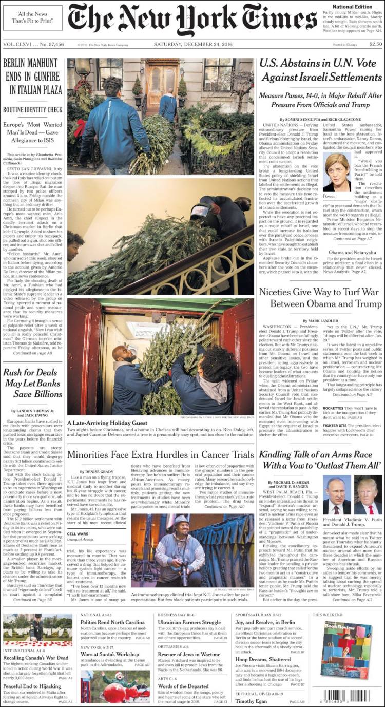 Em fim de governo, já em transição, o que pretendeu Obama ao incentivar a retomada de uma resolução já adiada por quem a tinha proposto, o Egito? O que Obama fez em oito anos para sentar à mesa de negociações palestinos e israelenses? Quis peitar o próximo presidente Donald Trump? Vingar-se do premiê Nethanyahu, que fez campanha contra o acordo nuclear EUA-Irã diretamente no Congresso americano, jogando-o para escanteio? Não vejo motivo que justifique uma decisão que herdará seu sucessor, dia 20 de janeiro. Um partido que perdeu as eleições não dará andamento no Congresso à mais uma resolução “sem dentes” — aquelas que não exigem implementação.